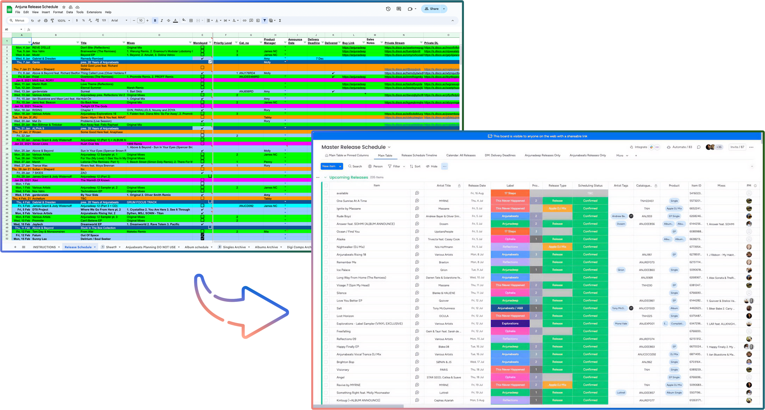 Strategic rollout plan: A phased rollout plan was developed, starting with the Product Managers, then A&R, Finance, Design, and Marketing. Over 10 weeks, I worked closely with Monday.com to onboard each department, conducting weekly 1.5-hour calls to field requests and refine the system.